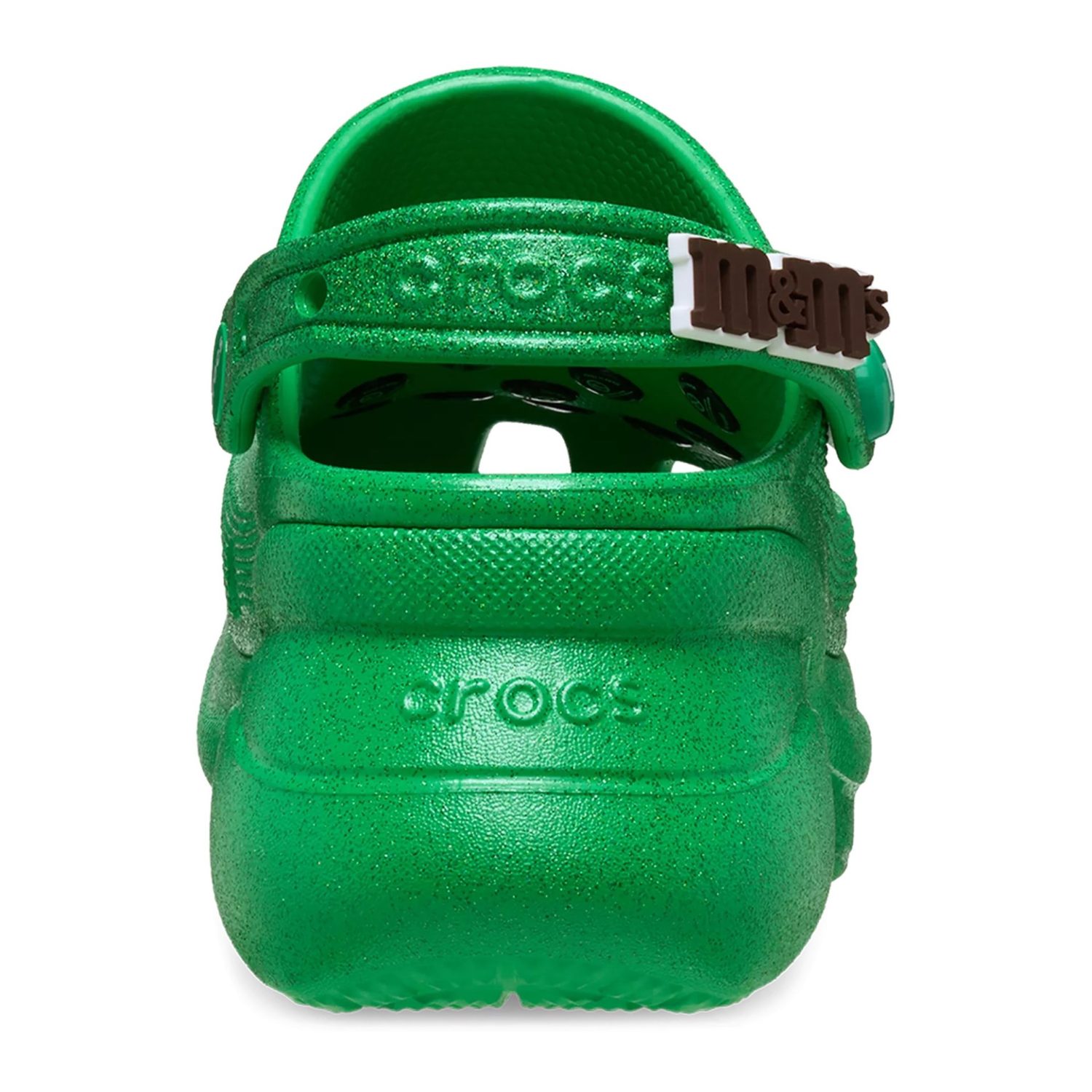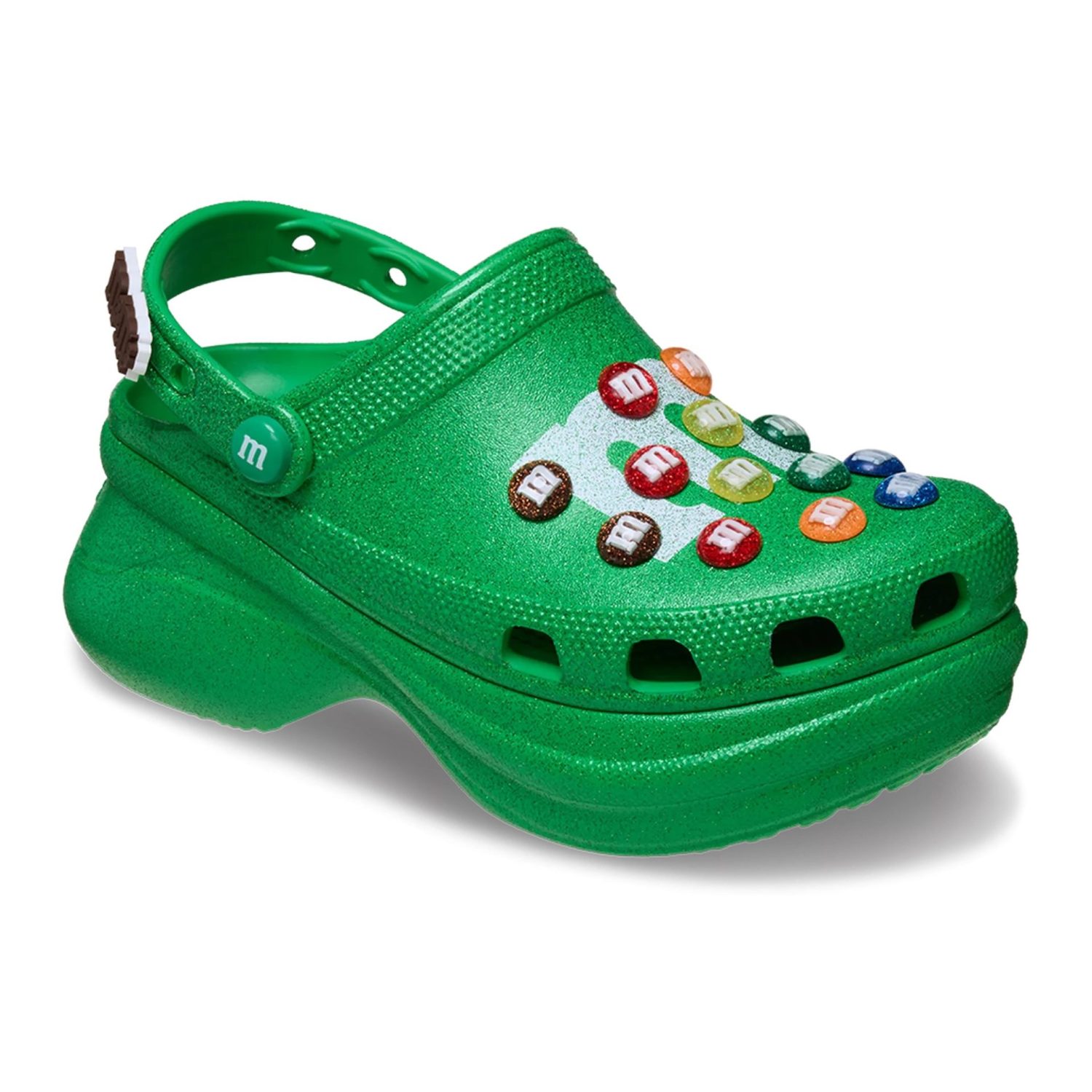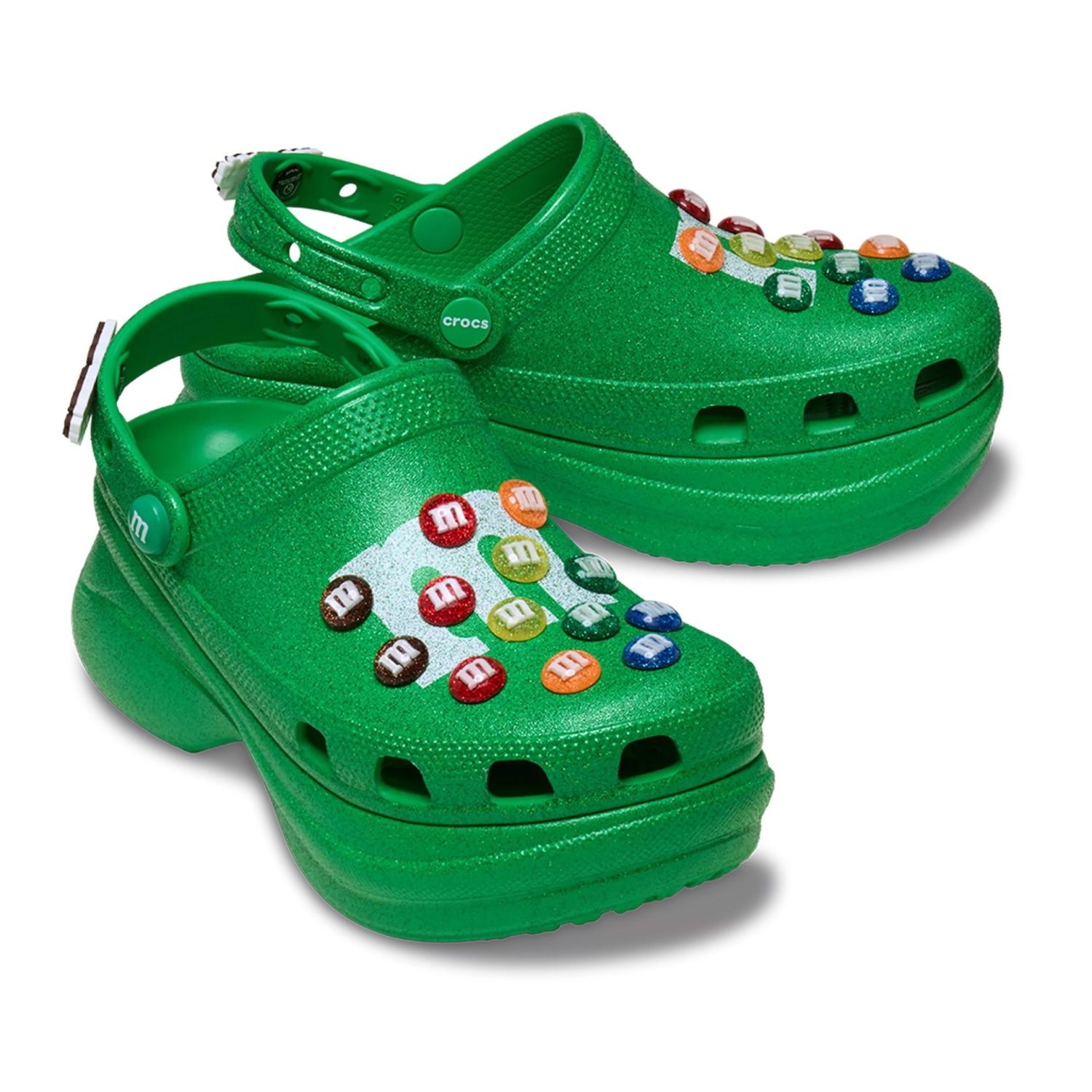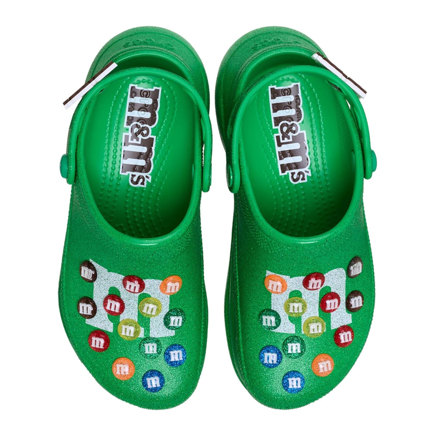 - Bae Clog M&M’s: designed with women in mind, this style goes all-in on sparkle with a glitter finish, chunky platform sole, and candy-shaped charms stamped with the signature “M.”