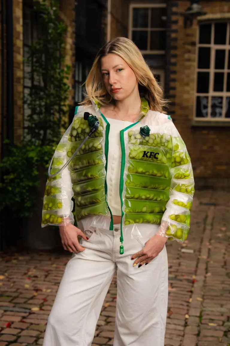 Called the “Pickle Puffer,” the jacket is exactly what it sounds like. A transparent puffer packed with sliced pickles floating in brine.