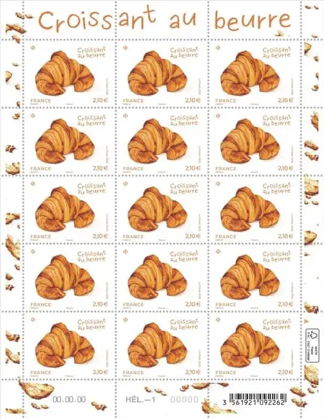 Printed in 600,000 copies and sold for €2.10, the golden stamp was designed by Frédérique Vernillet and produced by Philaposte in Dordogne. Its secret lies in a special ink infused with micro-capsules of scent; just rub it gently, and the smell of a warm, flaky croissant fills the air.