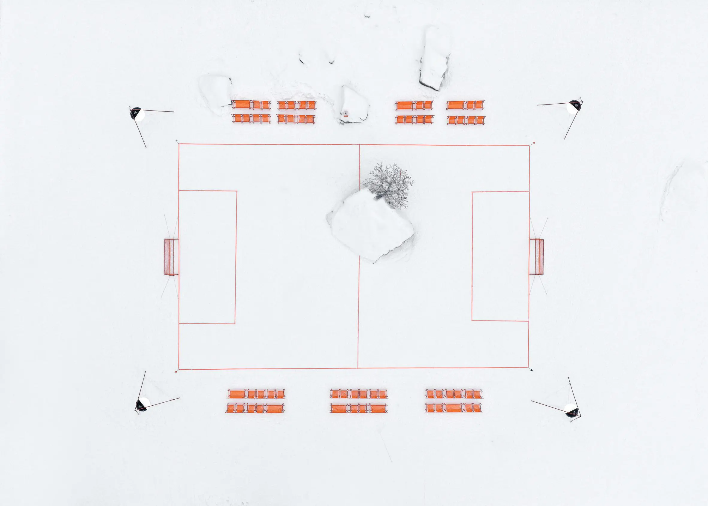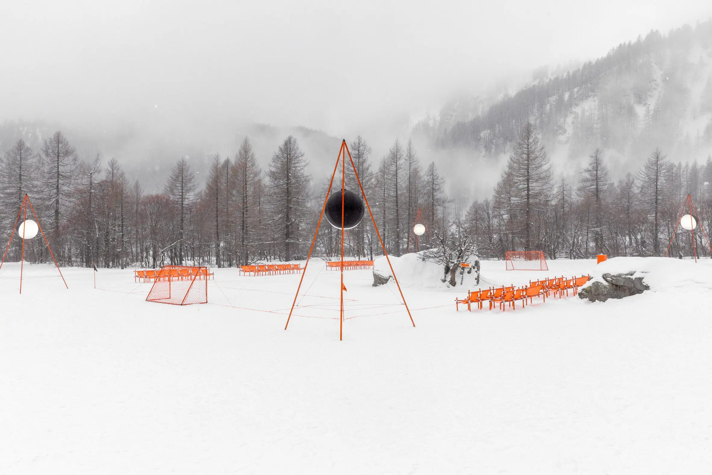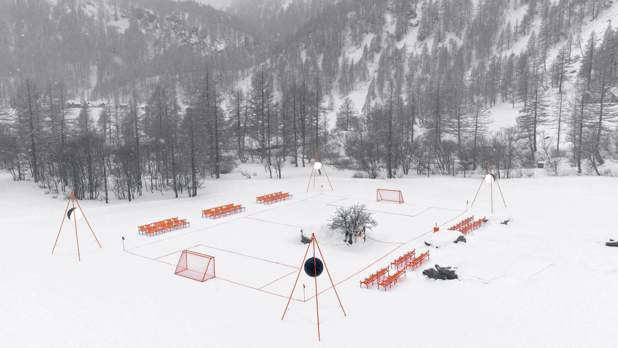 Once assembled, it transforms natural terrain into a functional pitch, making it possible to organize matches in unexpected locations, from rocky mountainsides to snowy landscapes.