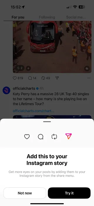 Meta has been actively promoting cross-posting between Threads and Instagram since Threads launched. Many users have seen full-screen prompts encouraging them to share their latest Thread to Stories, often framed around increased reach and engagement.
