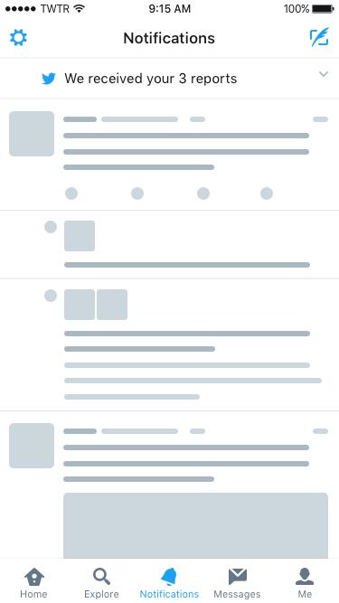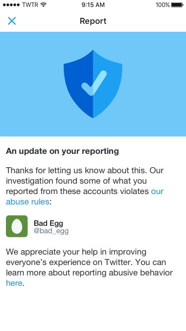 [quote]We’re continuing to improve the transparency and openness of our reporting process. You’ll start to hear more from us about accounts or Tweets that you’ve reported to our support teams–both when you report harassment directed at you or another account. You will be notified when we’ve received your report and informed if we take further action. This will all be visible in your notifications tab on our app.[/quote]